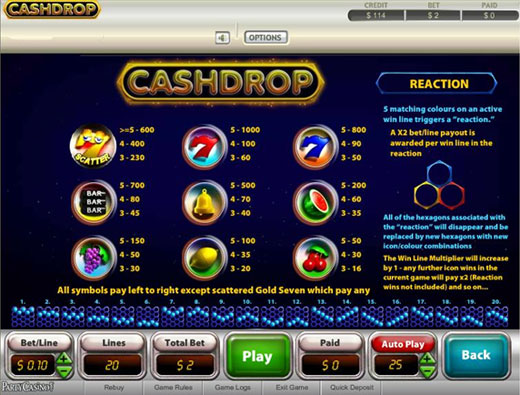 - A "Drop" Reaction: When all icon wins have been registered, there will be a check for corresponding hexagon colours along activated lines. When 5 matching coloured hexagon appear on a payline; a "reaction" is created. All of the hexagons associated with the "reaction" will disappear. New hexagons will drop in to the vacant spaces with new icon/colour combinations. Each reaction will pay x2 the stake per line used for the respective game and the win line multiplier will advance by 1.