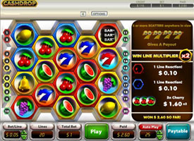Cash Drop is a 20 fixed win lines game that consists of a draw area of 18 hexagons which will rotate on an axis and then stop, producing a random hexagon colour and icon. The player receives a payout for connecting icons and multiplier wins for connecting colours.