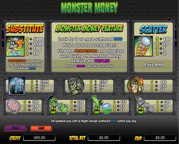 Monster Money is a five-reel, twenty-line slot game with a 'Monster Money' feature. The Monster Money Feature is triggered when three or more Scattered Rod appear anywhere.