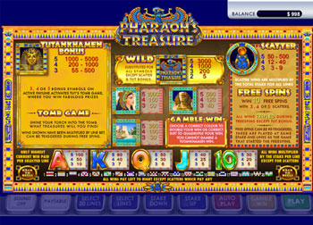 Pharaoh's Treasure is a 5 reel, 20-line slot game which includes scatter symbols and wild symbols. Four types of wins are available to the player: