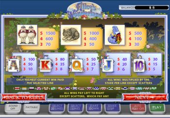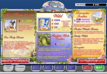 Adventures in Wonderland es una tragaperras de cinco cilindros y 20 líneas de pago. El juego ofrece un símbolo comodín y los juegos de bonificación White Rabbit (Conejo blanco), Mad Hatter Tea Party (Fiesta del té) y el Rabbit Hole (Madriguera). El juego de bonificación White Rabbit (comodines fijos y tiradas gratuitas) se activa cuando 3 símbolos Scatter (Conejo blanco) aparecen en cualquier lugar visible del panel de cilindros. El juego de bonificación Mad Hatter Tea Party se activa cuando 3 símbolos Scatter (Sombrerero) aparecen en cualquier lugar visible del panel de cilindros. El juego de bonificación Rabbit Hole se activa cuando aparece un símbolo Scatter (Madriguera) en cualquier lugar del cilindro central. El comodín (Alicia) sustituye a los demás símbolos, excepto a los Scatter (Mad Hatter, Rabbit Hole y White Rabbit).
