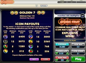 Atomic Fruit es un juego con diez líneas fijas y 16 núcleos formados cada uno por 4 esferas y un color con un juego adicional de concentraciones. Cuando comienza el juego, los símbolos rotan alrededor de cada esfera como átomos y luego se detienen, formando un núcleo compuesto por 4 símbolos aleatorios de un color aleatorio. Obtendrá premio si los símbolos coindicen en los núcleos a lo largo de una de las líneas de pago. Los símbolos adicionales que coincidan en cada núcleo constituyen por separado premios del mismo tipo. El número de premios para un tipo de símbolo en particular es equivalente al número de símbolos idénticos en cada núcleo multiplicados unos con otros. Un premio de concentración (cluster) se otorga cuando coinciden 7 o más núcleos adyacentes del mismo color conectados horizontalmente y/o verticalmente.