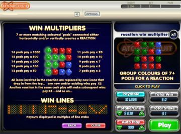 - Cada vez que se produce una reacción de concentraciones, los núcleos involucrados en dicha reacción desaparecen y se crean espacios vacíos. Acto seguido, nuevos núcleos caen en los espacios libres y el multiplicador de reacción aumenta en 1. Si se produce otra reacción después de la sustitución de los núcleos, los premios se pagan con un factor x2. Si se produce otra reacción de concentraciones, los núcleos se sustituyen, los premios se pagan x3 y así sucesivamente...