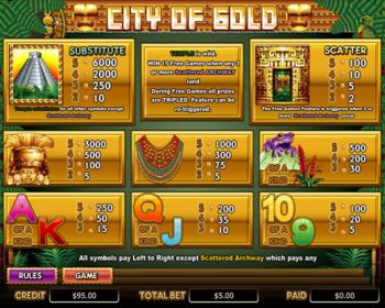 City of Gold es una máquina tragaperras de cinco cilindros y veinte líneas de pago con juego de tiradas gratuitas. El juego de tiradas gratuitas se activa automáticamente cuando aparecen 3 o más símbolos Scatter (Bóveda) en cualquier posición. Los premios conseguidos durante tiradas gratuitas se triplican. Si durante las tiradas gratuitas aparecen 3 o más símbolos Scatter (Bóveda), el usuario obtendrá quince tiradas gratuitas adicionales, y todos los premios de las tiradas gratuitas se triplicarán.