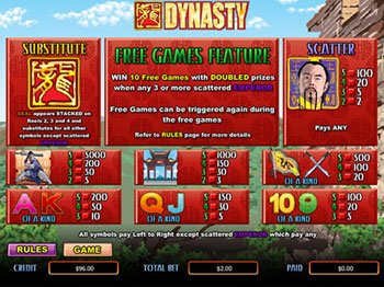 Dynasty is a five-reel, twenty-line slot game with a Free Games Feature. The Free Games Feature is triggered when 3 or more scattered EMPEROR appear anywhere on the screen. 10 free games are awarded, during which all prizes are DOUBLED. Free Games Feature can be retriggered during free games in the same way as mentioned above and payoff rules remain the same. SEAL appears on Reels 2, 3 and 4 only and substitutes for all other symbols except scattered EMPEROR.