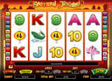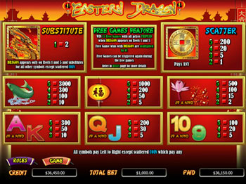 Eastern Dragon is a five-reel, twenty-line slot game with a 'free game' feature. The Free Games Feature is triggered when the Dragon appears any where on reels 1 and 5 at the same time. 15 free games are awarded, during which all prizes are tripled. The feature can be retriggered during free games when the Dragon appears any where on reels 1 and 5 at the same time. Dragon appears on Reels 1 and 5 only and substitutes for all other symbols except Scattered Coin.