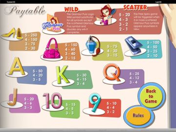 - El juego "Glamour Puss" se activa cuando aparecen 3 o más símbolos Scatter (Chica glamourosa) en cualquier lugar del panel de cilindros.