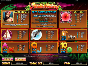 Paradise Riches es una máquina tragaperras de cinco cilindros y veinte líneas de pago con juego de tiradas gratuitas. El juego de tiradas gratuitas se activa automáticamente cuando aparecen tres o más símbolos Scatter (Flor) en cualquier lugar del panel de cilindros. Se otorgan doce tiradas gratuitas, cuyos premios se triplican. El juego de tiradas gratuitas se activa de nuevo cuando aparecen tres o más símbolos Scatter (Flor) en cualquier lugar del panel de cilindros.