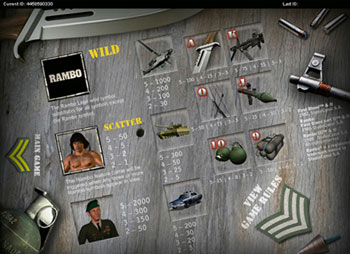 Rambo es una máquina tragaperras de 5 cilindros y 20 líneas de pago con un juego de bonificación "Rambo" que le ofrecerá tiradas gratuitas. El juego también dispone de un logo "Rambo" que se expande. El logo de "Rambo" sustituye a todos los símbolos, a excepción del símbolo Scatter (John Rambo). 3 o más símbolos Scatter activarán el juego de bonificación "Rambo".