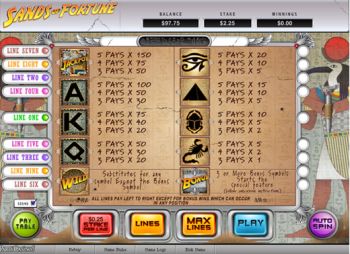 Sands of Fortune es una máquina tragaperras de cinco cilindros y nueve líneas de pago con juego de bonificación que le permitirá ganar premios adicionales. En este juego, el usuario dispone de varias oportunidades (determinadas aleatoriamente, hasta un máximo de cinco) para elegir puertas. Detrás de cada puerta se esconde un premio. El juego de bonificación se activa en cuanto aparecen tres o más símbolos de bonificación en cualquier posición.