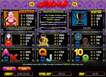 Sumo is a five-reel, twenty-paylines slot game with a ‘Trophy’ feature. The Trophy Feature is awarded when 3 or more Scattered Trophy appears any where.