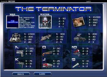 Terminator es una máquina tragaperras de cinco cilindros y 20 líneas de pago con un juego de tiradas gratuitas y dos juegos de bonificación que le permiten ganar premios adicionales. También se ofrece un comodín ("Terminator") El Terminator puede sustituir a cualquier símbolo, excepto a la cabeza del T800. Con un mínimo de 3 cabezas del T800 en cualquier lugar de los cilindros, se activa el juego de bonificación "Encontrar a Sarah Connor". Las tiradas gratuitas se obtienen cuando la bomba de nitrógeno aparece en cualquier parte del primer cilindro, la motocicleta en cualquier parte del tercero y el tanque en cualquier parte del quinto cilindro. La ronda "Kyle Reese" se inicia aleatoriamente.