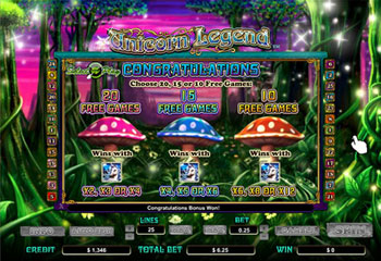 Unicorn Legend es una máquina tragaperras de cinco cilindros y 25 líneas de pago con juego de bonificación de tiradas gratuitas y juego de pronósticos. El juego de bonificación de tiradas gratuitas se activa cuando aparecen 3 o más símbolos Scatter (Emblema) en cualquier lugar del panel de cilindros. El usuario accede a una pantalla de selección ("Select a Play"), en la que puede obtener 10, 15 o 20 tiradas gratuitas. El juego de pronósticos se ofrece para los premios del juego principal y para el premio total de las tiradas gratuitas (que incluye el premio Scatter de la tirada que las activó).